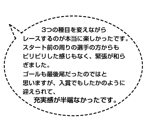 3つの種目を変えながらレースするのが本当に楽しかったです。スタート前の周りの選手の方からもピリピリした感じもなく、緊張が和らぎました。