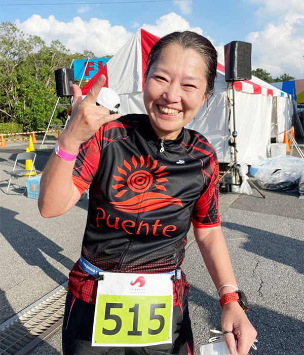 以前よりトライアスロンに興味はありましたが、トライアスロン=アイアンマンだと思っていて、特別な人のスポーツだと思い諦めていましたが、色々な距離がある事を知り「もしかしたら挑戦できるかも?」と思い、Webで検索してプエンテにたどり着きました。出身が千葉だったので、親近感に加え、HPの友里恵さんの笑顔で、ここなら楽しく挑戦できると思い、申し込みをしました。